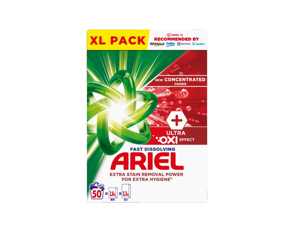 Ariel, doporučovaný značkami Whirlpool, Electrolux, Candy a Beko, představuje prací prášek Ariel +Ultra Oxi Effect Fast Dissolving. S koncentrovaným pracím práškem Ariel nyní získáváte koncentrovanější výkon a možnost praní většího množství prádla na gram prášku. Ariel +Ultra Oxi Effect zajišťuje extra schopnost odstraňování skvrn pro mimořádnou hygienu (ve srovnání s práškem Ariel Mountain Spring) a poskytuje vynikající zkušenosti a výsledky i při praní ve studené vodě.