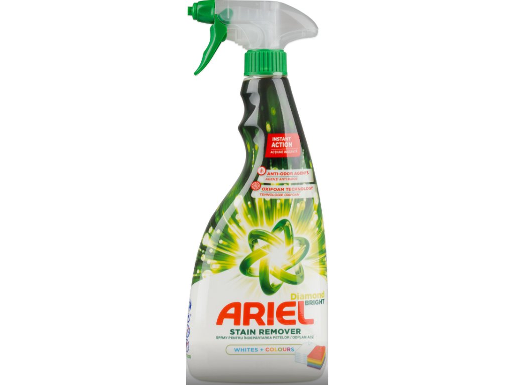 ARIEL sprej na skvrny. Odstraňovač skvrn ve spreji je účinný i proti silnému znečištění a odolným skvrnám například od kávy, oleje či kečupu. Díky pěnovému složení je vysoce účinný při čištění konkrétního místa na oblečení. Zároveň neutralizuje zápach a díky vyváženému složení je vhodný na bílé i barevné prádlo. Použití: Před praním jednoduše nastříkejte na skvrnu, nechte krátce působit. Poté vyperte v pračce s pracím prostředkem.
