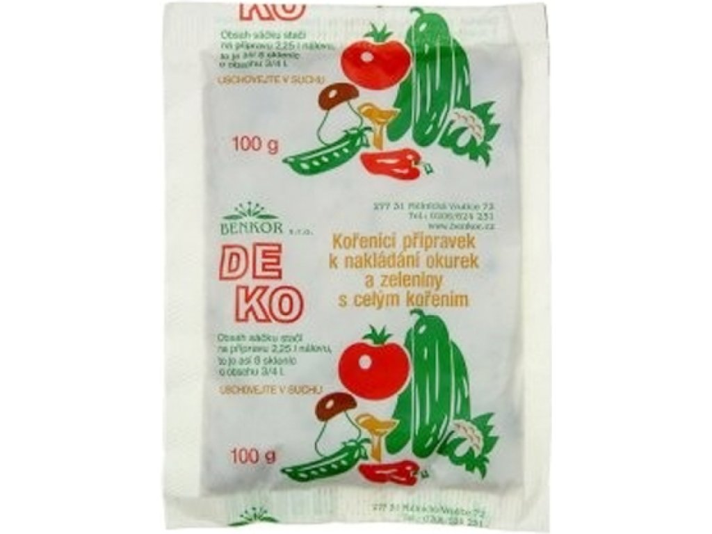 Deko je tradiční receptura od tradičního výrobce nakládacího přípravku DEKO. Obsahuje sůl, kyselinu benzoovou, extrakt koření a celé koření.