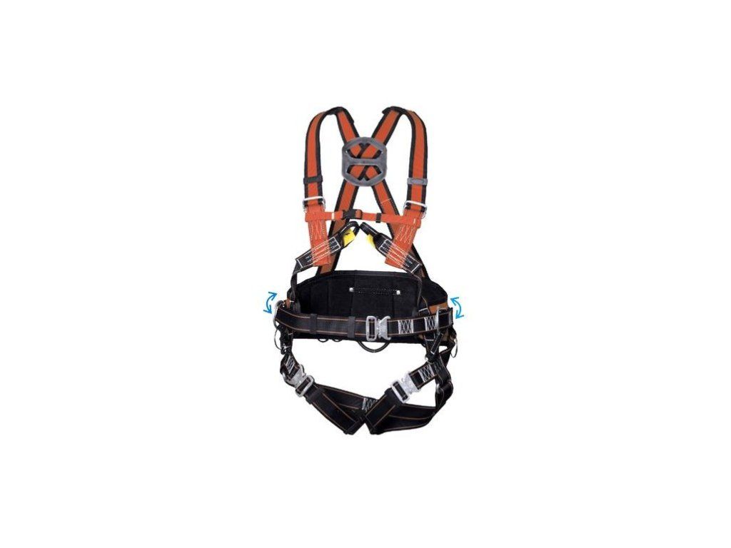 Bezpečnostní celotělový postroj, základní vybavení: zadní připojovací spona - pro připojení systému zachycení pádu, přední připojovací smyčky - pro připojení systému zachycení pádu, zapínací a nastavovací spony - pro komfortní nasazení a používání postroje. Pohyblivý polohovací pás s automatickou sponou.