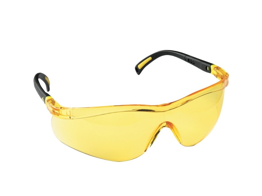 Brýle s polykarbonátovým zorníkem, nastavitelný úhel a délka stranic, sportovní vzhled, zorník s úpravou proti poškrábání a orosení, třída F EN166, optická třída 1, žlutý zorník s ochranným filtrem proti UV záření EN170.