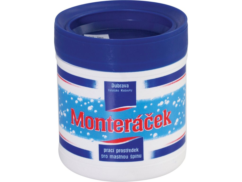 Prací prášek Monteráček 500 g, prací prostředek rozpouští a odstraňuje mastnou špínu z tkanin již při teplotě do 60°C, pere bez vyvářky montérky, pracovní pláště, utěrky a jiné látky znečištěné tuky a oleji.