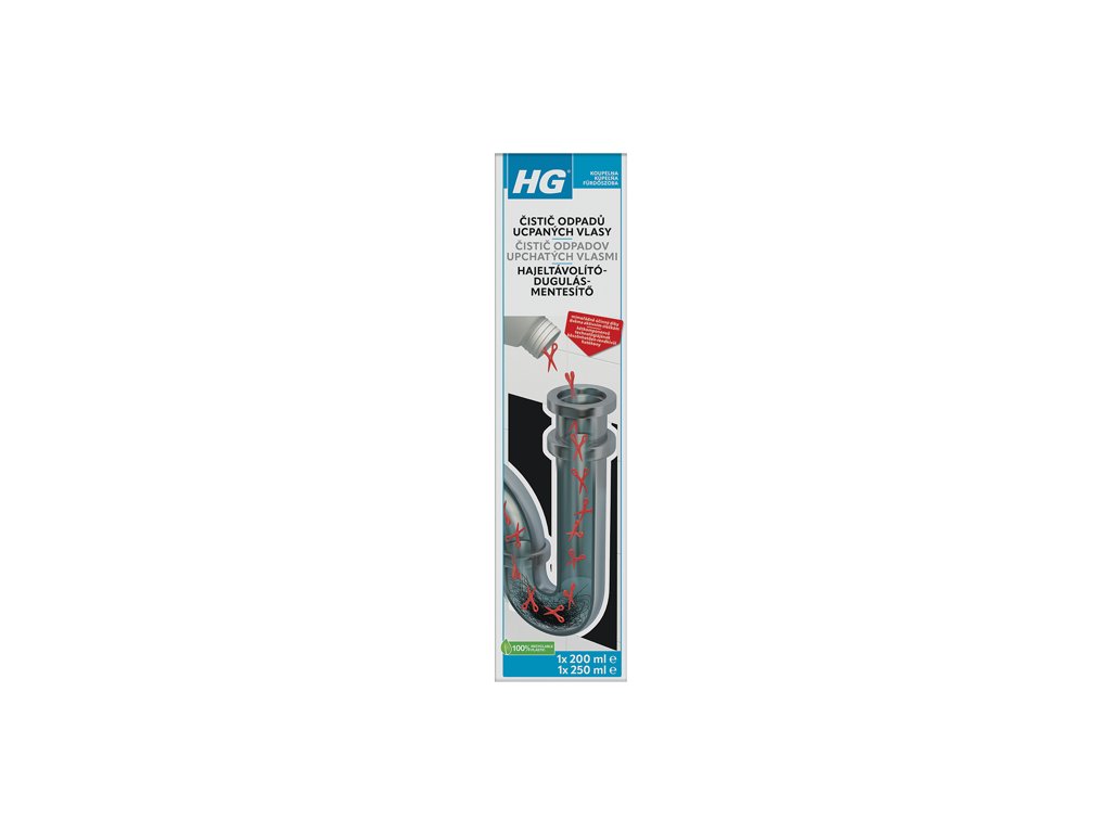 Účinnost HG čističe odpadů ucpaných vlasy byla zvýšena přidáním hydroxidu draselného, takže rychle uvolňuje vlasy, rozpouští zbytky mýdla a všechny další složky v ucpaném odpadu. HG čistič odpadů ucpaných vlasy je velmi snadno použitelný v ucpaných odpadech sprchových koutů nebo koupelnových umyvadel. Díky 2 složkám je neuvěřitelně účinný při odstraňování vlasů, zbytků mýdla, kožní mastnoty a zubních past.