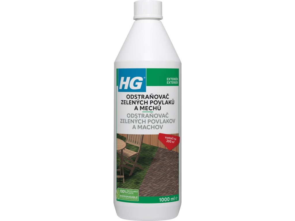 Přípravek HG odstraňovač zelených povlaků a mechů odstraňuje nepříjemné šedozelené povlaky a mechy z teras, cest, kamenů, zdí, střech, květináčů a pod. Po použití přípravku povlak během 36 ti hodin zmizí. Na očištěném povrchu zůstanou stopy přípravku preventivně působících příštích pár měsíců. Přípravek “HG odstraňovač zelených povlaků a mechů“ není škodlivý pro trávu ani jiné rostliny. Přípravek smí být aplikován pouze při suchém počasí a nejlépe v období, kdy v průběhu dvou dnů není očekáván déšť. Přípravek naře?te s vodou, v poměru 1:20 – to je zhruba čtvrt láhve přípravku na půl kbelíku vody. Roztok naneste pomocí konve na vodu, smetákem, kartáčem nebo rozprašovačem. Protože HG odstraňovač zelených povlaků a mechů neobsahuje žádné nebezpečné látky, nemusí být oplachován vodou. Po očištění je povrch několik měsíců perfektně chráněn proti dalšímu růstu těchto nepříjemných povlaků.