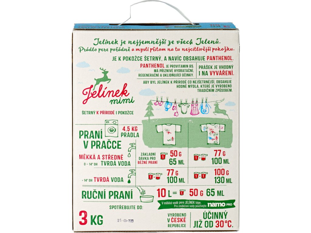 Jelínek je nejjemnější ze všech Jelenů. Prádlo pere pořádně a myslí přitom na tu nejcitlivější pokožku. K pokožce je šetrný, a navíc obsahuje panthenol.