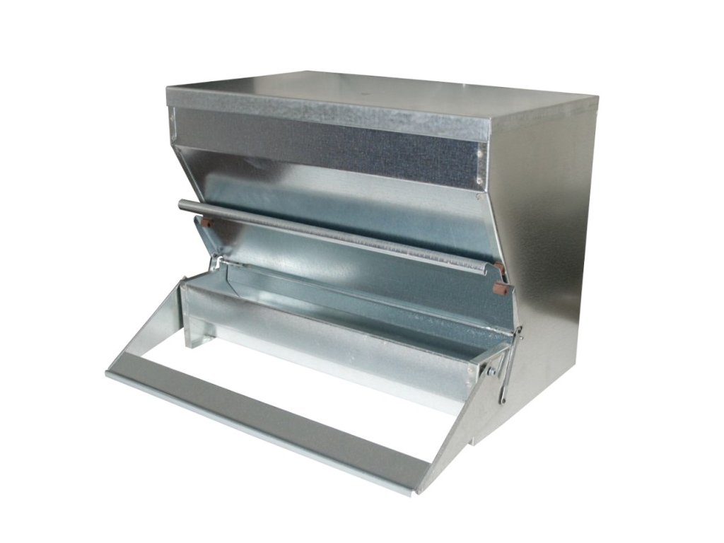 Vaše kuřata i slepice se pravděpodobně dělí o krmivo s hejny volně žijícími ptáky a hlodavci, kteří navíc roznášejí parazity a nemoci. Tímto přicházíte o 40 - 50% kvalitního krmiva- pšenice. Proto jsem vymyslel toto Uzavíratelné Nášlapné Krmítko jednostranné ( UNK 1 - č.001 ), které je vyrobeno z pozinkovaného plechu. Krmítko se umístní pod přístřešek, na rovném, suchém podkladu. Krátkodobě vydrží na děšti, ale dlouhodobě NE. Pšenici nedoporučuji míchat, slepice zobákem vyhrabávají jiné krmivo, např. kukuřici nasypat 2x týdně pod víko do vyzobávací vany. Zhodnocení krmiva je 100%. Další výhodou je, že krmítko nemusíme plnit každý den. Při 120g denní dávce pšenice a hejnu v počtu 10 - 12ks slepic, nám zásobník vydrží 14 i více dnů, v závislosti na další doplňková krmiva, výběh, kuchyňské zbytky atd.