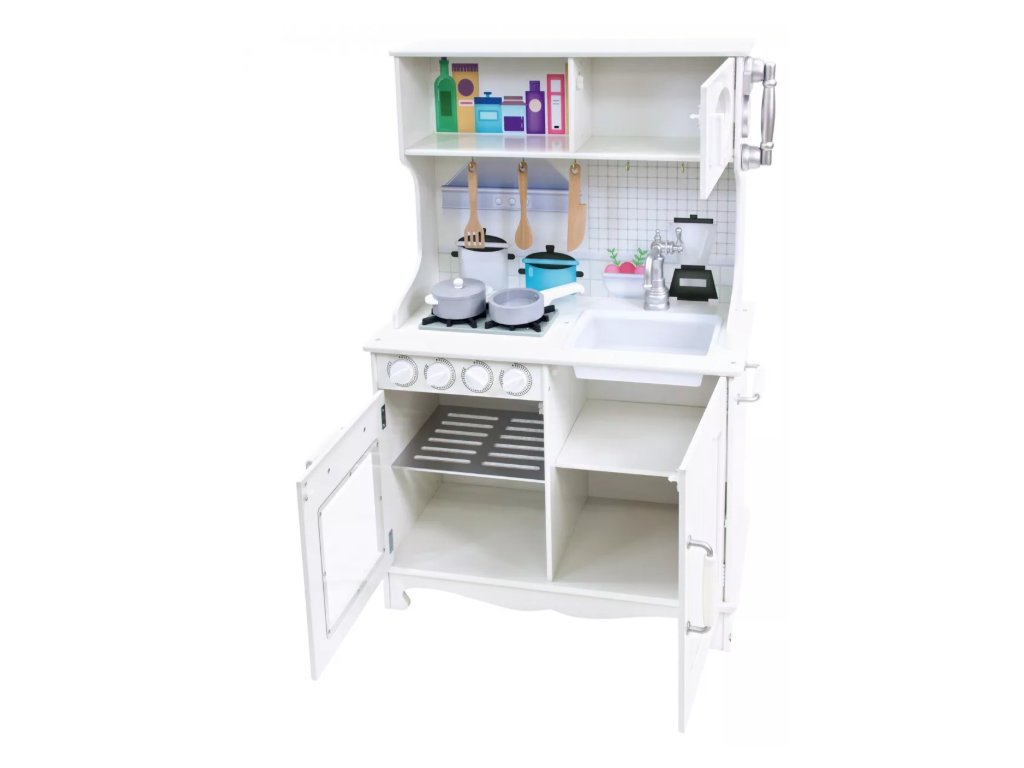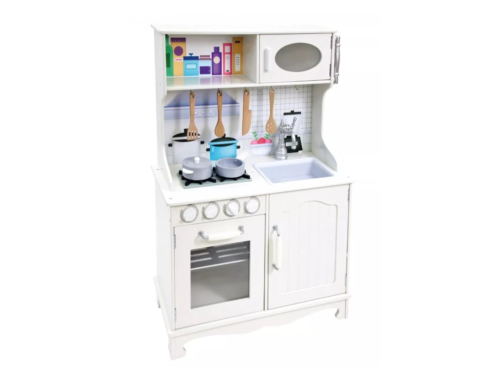 Krásná dětská kuchyňka ve stylu PROVANCE pro malé kuchařky. Kuchyňka je vybavená sporákem s troubou, dřezem a vestavěnou mikrovlnou troubou. Součástí jsou 4 ks kuchyňského náčiní, 2 hrnce a telefon. Rozměr: 65,3 x 97,3 x 30 cm