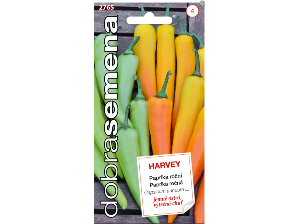 HARVEY ¦ raná, mírně pálivá paprika typu "kozí roh" s velice chutnými plody. Plody jsou hladké, štíhlé, kónické, zrající ze světle zelené do žluto oranžové barvy. Rostlina je vyšší, s výbornou násadou, vyžaduje při pěstování oporu. Nejlépe se jí daří na záhřevné, plně osluněné lokalitě. Pálivost 10.000 - 30.000 SHU.