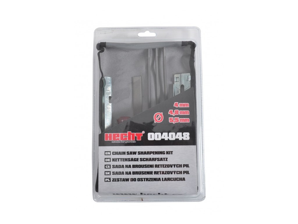 Sada pro broušení pilových řetězů Hecht. Sada obsahuje jeden plochý pilník, kulaté pilníky průměrech 4 mm, 4,8 mm a 5,5 mm, držák pilníků, uhlové a hloubkové dorazy pro správné vedení pilníků při broušení. Vše je uloženo v kvalitním textilním pouzdře.