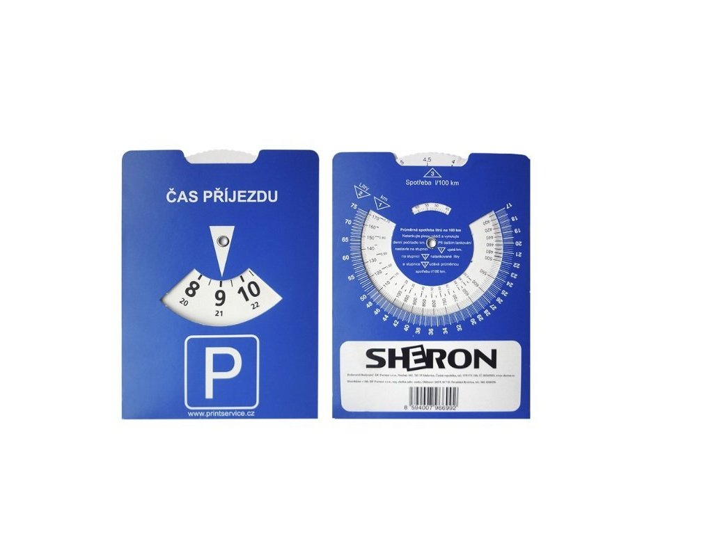 Praktické parkovací hodniny 2 v 1 od společnosti Sheron. Jedna strana slouží jako hodiny, druhá strana poslouží jako jednoduchý záznamník spotřeby autA.