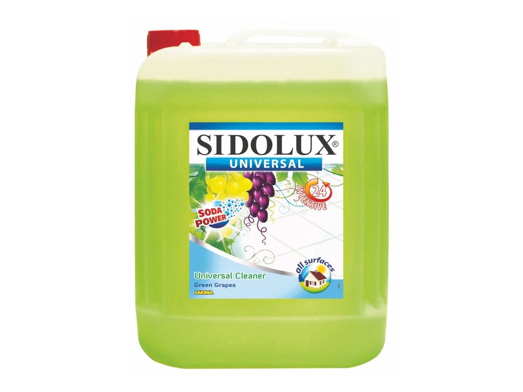 Sidolux univerzální čisticí prostředek s vůní zelených hroznů je spojením neodolatelné dlouhotrvající ovocné vůně s neuvěřitelně účinnými čistícími vlastnostmi. Tajemstvím jeho nebývalé síly v boji prosti nečistotě je unikátní systém Soda Power, jehož působení změkčuje vodu, a díky tomu odstraňuje Sidolux univerzální čisticí prostředek velmi rychle nečistoty z povrchu. S univerzálním čisticím prostředkem Sidolux je úklid rychlejší, jednodušší a mnohem účinnější. Mytí podlahy už se obejde bez drhnutí a povrch zůstane beze šmouh. Produkt lze použít na všechny omyvatelné povrchy, jako jsou okna, podlahy, stoly, pracovní desky atd.