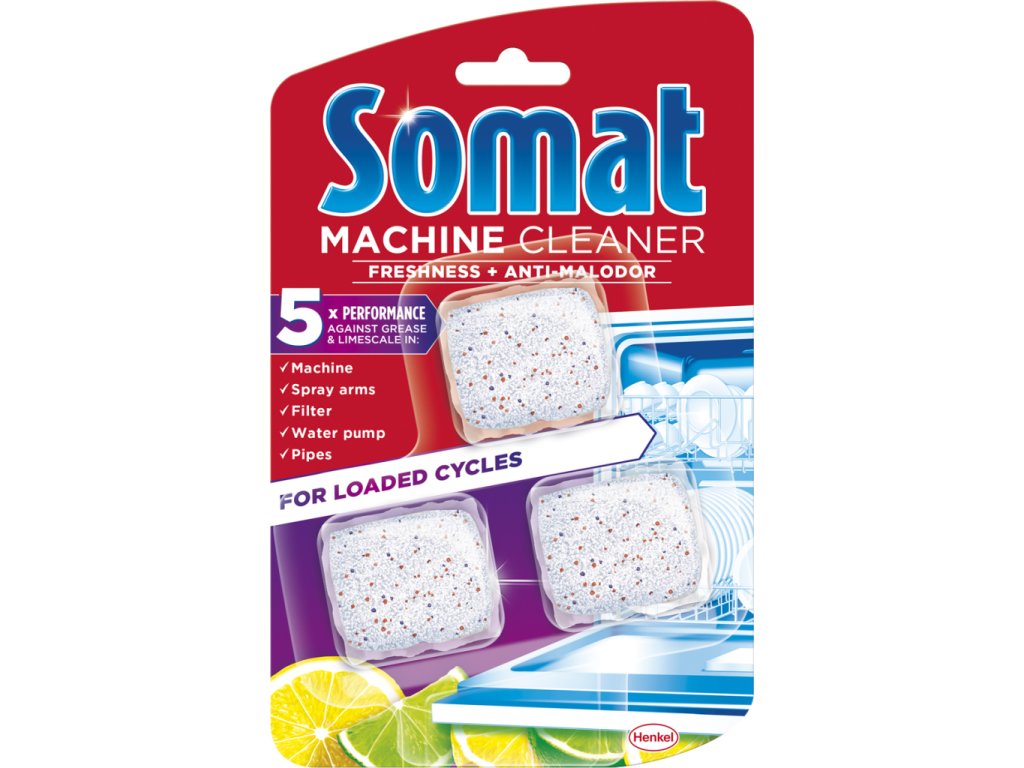 Čistič Somat Machine Cleaner je čisticí prostředek speciálně určený do myček na nádobí. Balení obsahuje tři tablety, které lze použít během běžného cyklu mytí nádobí při plné myčce. Předností čističe je jeho působení hluboko v myčce, kdy účinně odstraňuje veškerou mastnotu a usazeniny vodního kamene, a to jak ve stříkacích tryskách, tak i ve filtru. Přípravek je vhodný pro použití se všemi druhy nádobí určených do myčky. Pro dokonalou péči o vaši myčku na nádobí je tento čistič Somat tou správnou volbou.