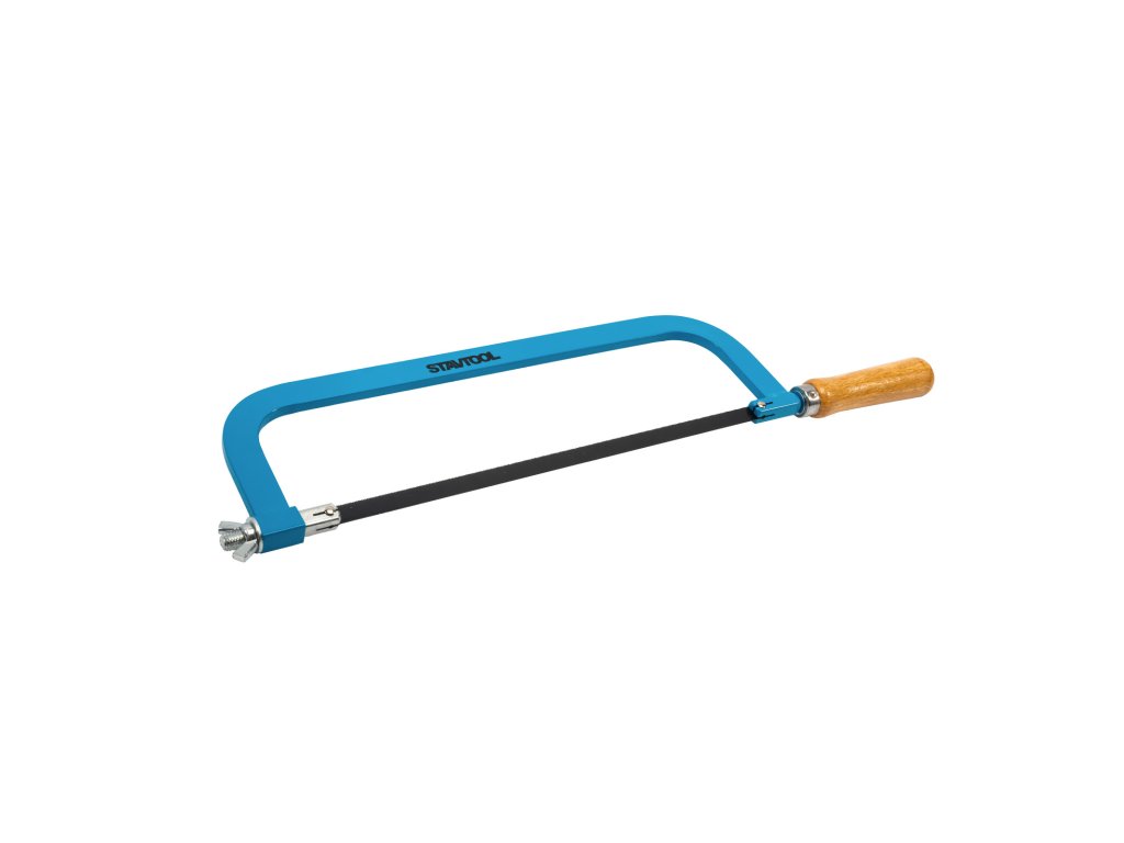 Rámová pilka na kov s přímou dřevěnou rukojetí.