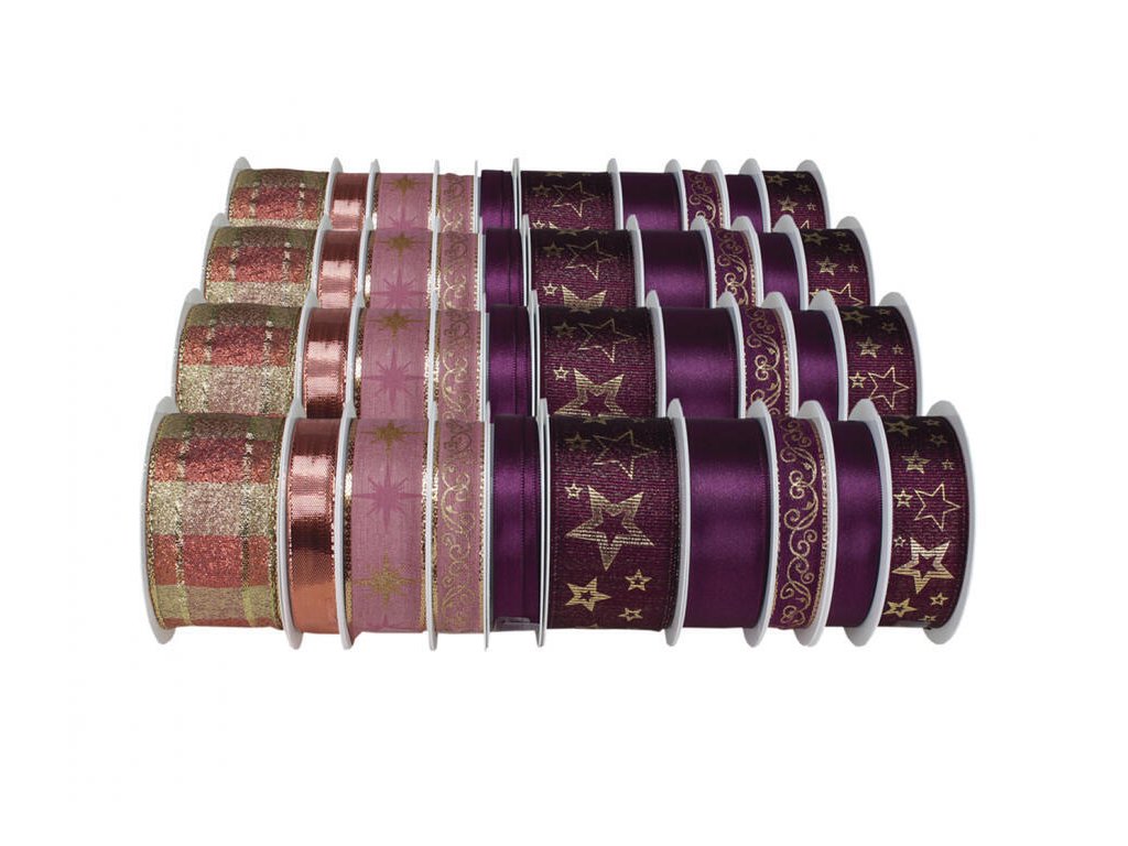 Sada dekoračních stuh na cívce. Stuhy jsou v různých šířkách a odstínech, které se vzájemně dají dobře kombinovat. Vhodné pro období Vánoc. Rozměry: 12x 3m/1,5cm, 24x 2,5m/2,5cm, 4x 2m/4cm.