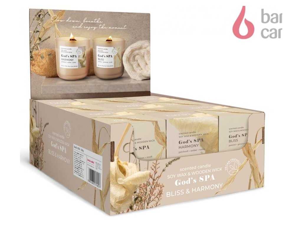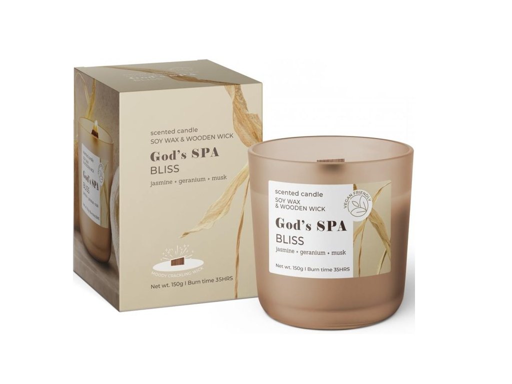 Svíčka se dvěma vůněmi v kónickém skle, spa - božská lázeň. Provedení: se sójovým voskem a dřevěným knotem. Baleno v luxusní dárkové krabičce. Dva dekory.