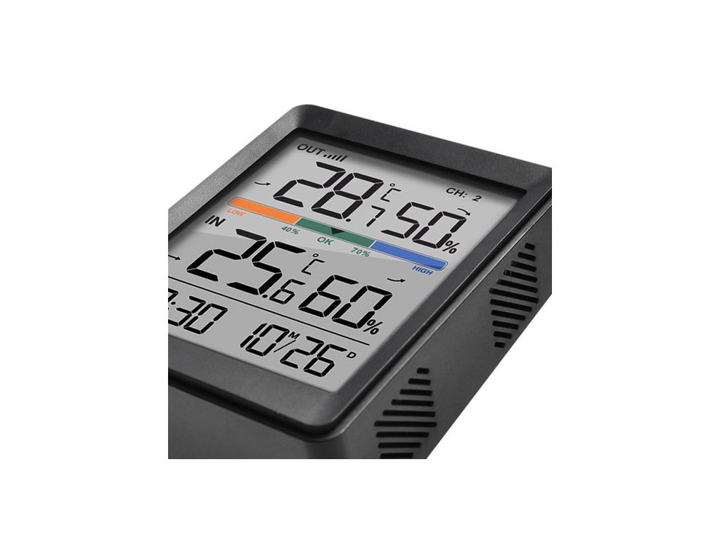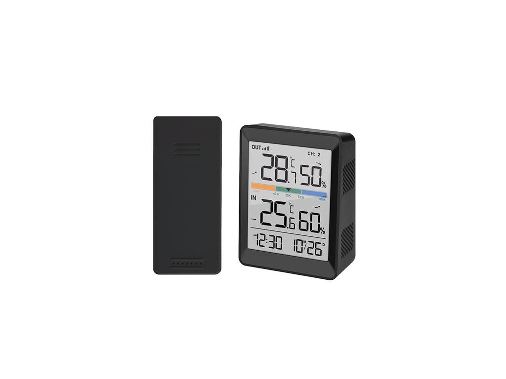 Digitální teploměr a vlhkoměr s měřením vnitřní teploty (-9,9°C až +50°C) a venkovní teploty (-40°C až +70°C). Měření vlhkosti v interiéru i exteriéru (20% až 95%). Paměť minimálních a maximálních hodnot pro teplotu a vlhkost, indikátor vývoje teploty a vlhkosti. Funkce hodin, budíku a časového formátu 12/24, zobrazení teploty ve °C/°F. Součástí balení je 1 bezdrátový senzor s dosahem až 60 m (bez překážek). Napájení: hlavní jednotka 2x AAA baterie, senzor 2x AAA baterie (není součástí balení). Barva: černá.