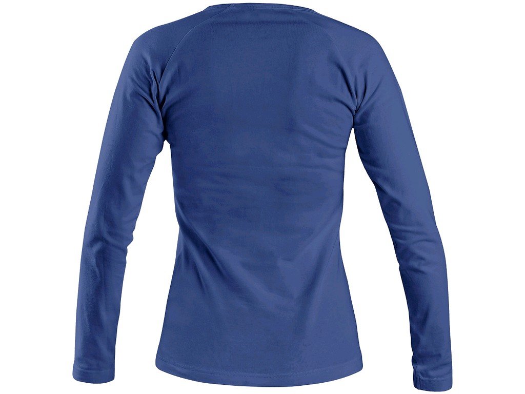 Dámské tričko s průkrčníkem do V. Dlouhý rukáv raglánového typu. Střih zvýrazňující dámskou postavu a elastan pro pružnost a dlouhodobé udržení tvaru. Finální silikonová úprava materiálu, která zajišťuje vyšší měkkost, rozměrovou stálost a omezuje žmolkovatění. Saténová vnitřní etiketa. Vhodné pro potisk a výšivku.