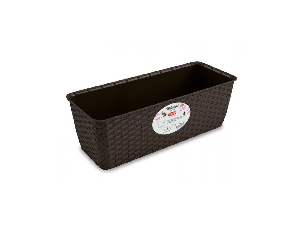 Plastový samozavlažovací truhlík věrně imituje rattanový výplet. Barva: hnědá. Šířka: 50 cm, výška: 16 cm, hloubka: 18 cm.
