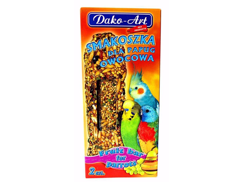 doplňkové krmivo pro andulky - ovocná tyčinka složení : obiloviny 63,1% - oves, proso, proso červené, saflor, pekařské výrobky 26,85% - mletý piškot zabarvený, cukr, pšeničná mouka, sušená - 6,26% - rozinky, sušená jablka, sušený rybíz, olejnatá semena 3,79% - len , slunečnice způsob podávín : zavěste tyčinku na klec vláknina 19,2%, tuky a oleje 18,7%, protein 14,1%, popel 5,5% balení : 2ks ILUSTRATIVNÍ FOTODoplňkové parametry