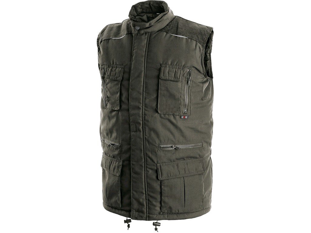 Zateplená vesta, ramena a límec pošitý manšestrem, pružné stažení průramku, možnost stažení vesty v pase, 14 kapes - z toho 3 kapsy uvnitř vesty.