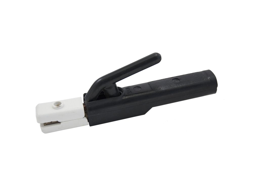 Držák elektrod v profesionálním provedení s izolovanou rukojetí, předlisovanými úchyty pro různé polohy elektrod při sváření a robustní svěrací pružinou. Typ 300 - určený pro transformátorové svářečky/invertory s maximálním svářecím proudem 300 A.