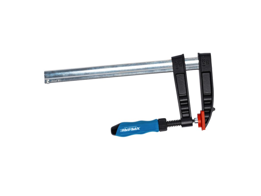 Svěrka má profilovaná litá ramena s plastovými koncovkami na čelistech a má dřevěnou šroubovou rukojeť.