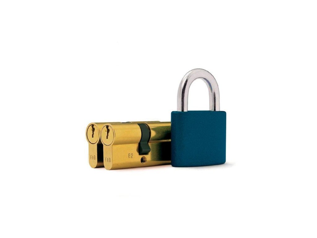 Souprava cylindrických vložek FAB 100 a visacího zámku FAB 80RSH se hodí k zabezpečení branek či garáží a umožňuje odemknout dvě cylindrické vložky a visací zámek jedním klíčem.